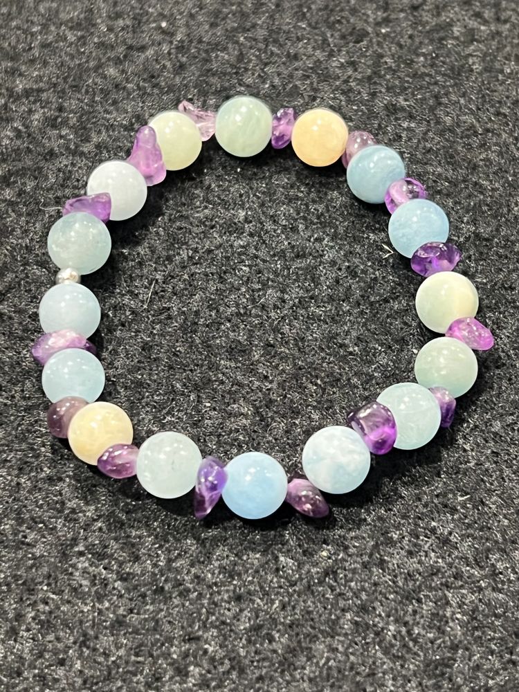 1. Materials: Made with genuine aquamarine and amethyst beads, strung on a durable elastic band for a comfortable and secure fit.