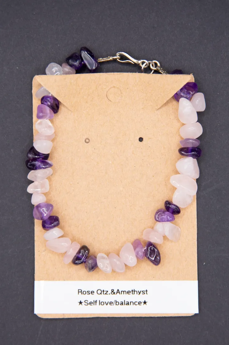 Embrace harmony and emotional well-being with the Rose Quartz and Amethyst Love & Balance Chip Bracelet. This beautifully handcrafted piece combines the nurturing energy of rose quartz with the calming clarity of amethyst, making it an ideal accessory for promoting love, balance, and spiritual growth.