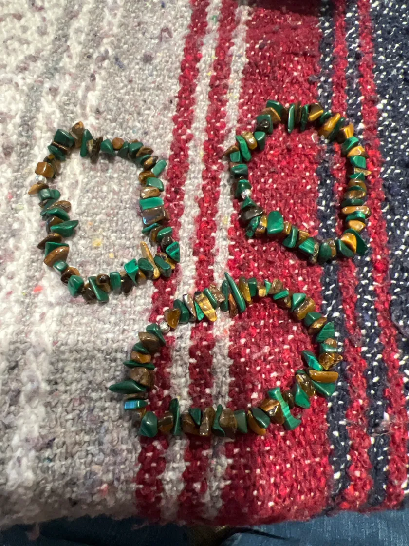 1. Materials: Made with genuine tiger’s eye and malachite chips, strung on a durable elastic band for a comfortable and adjustable fit.